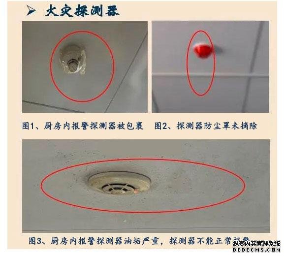 7、常见问题 餐饮场所厨房内的火灾探测器油垢严重,或为防止油垢将火灾探测器用保鲜膜包裹,或防尘罩未摘除,均影响探测器的正常报警功能。